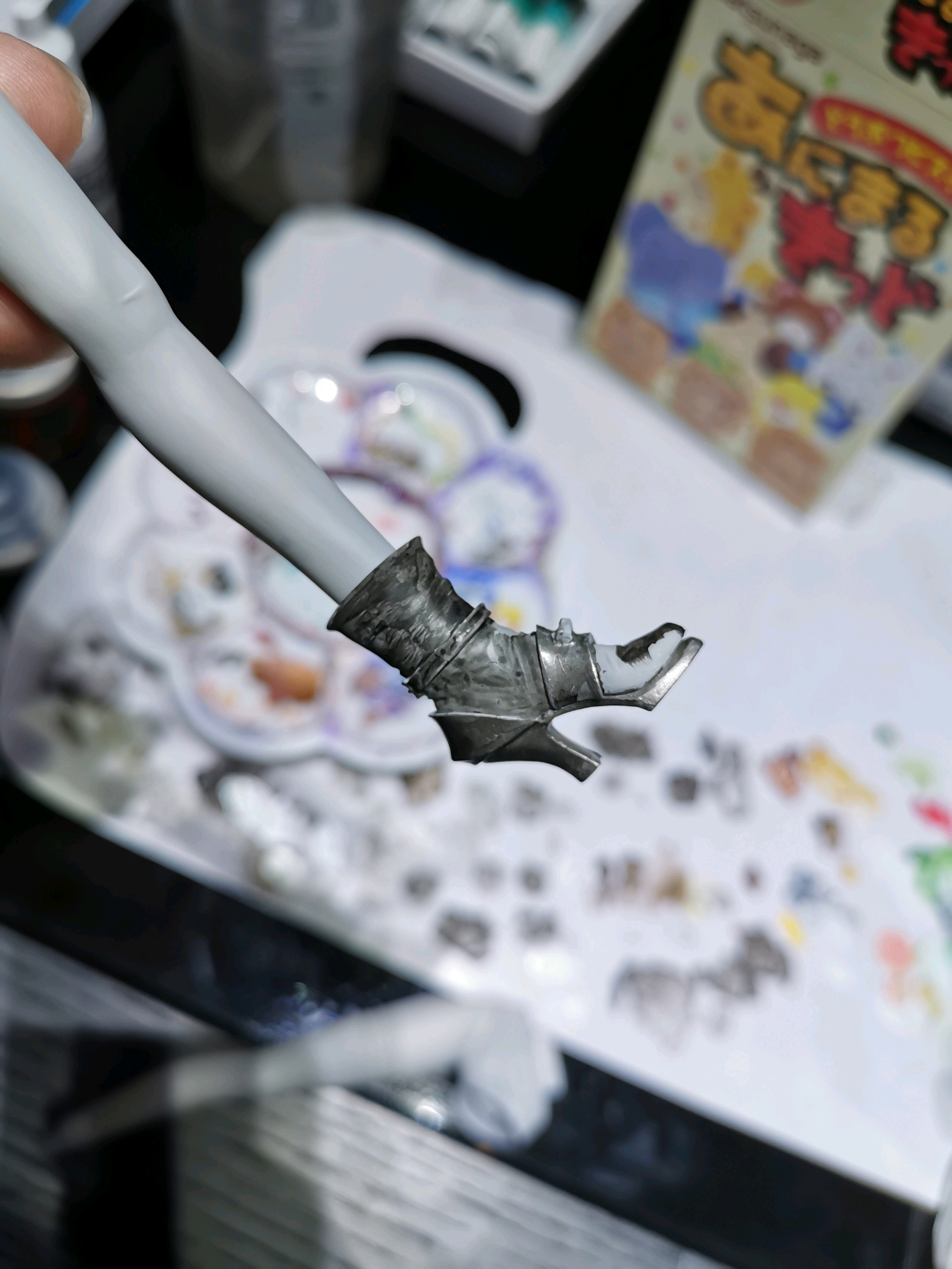 我做的這款貞德gk,手甲部分有接縫和鉚釘,這種部位就多洗一下,讓縫里變黑。這樣就能加強(qiáng)金屬質(zhì)感。 但是洗完以后,整個(gè)色調(diào)都變暗了。這時(shí)候就要進(jìn)行一輪補(bǔ)色。在那些不需要洗黑的部分重新補(bǔ)一下色,讓顏色重新“亮”起來。于是我們就有了暗的銀色和普通銀色二種顏色了。接下來,就是要再增加第三層明亮的銀色了。 用亮銀色勾畫出手甲的高光部分。通常是鎧甲的邊緣、凸起的部分等。這里要非常仔細(xì),手抖就麻煩了。用筆毛的尖端來勾,筆不一定要很細(xì),太細(xì)的筆吸不了墨,畫一筆就要沾一下顏料很麻煩。但是要保證筆頭的毛尖銳。鎧甲邊緣部分可以用側(cè)鋒蹭一下,小鉚釘則用筆尖輕輕點(diǎn)一個(gè)小點(diǎn)作為高光就行。 如果沒有亮銀色,那稍微加一點(diǎn)白色來代替也行。不過我建議還是備一支,亮銀色很多地方都能用到。 這樣鎧甲所有凸出的部分都有明亮一些的感覺了。如果不小心點(diǎn)的太顯眼了,色差太大了,可以用加了一些水的暗銀色抹一下顏色連接處,消除明顯色差。 然后,就是我翻車的地方了。 劍的涂裝。由于我之前打磨很粗糙,劍身上有很多細(xì)節(jié)沒打磨到,導(dǎo)致劍身涂出來不平整。注意!這是血的教訓(xùn),劍這種要求表現(xiàn)光亮和反光的光滑金屬面,一定要細(xì)細(xì)打磨,不能偷懶! 還有就是我開始時(shí)用了av金屬漆,濕漆掛不上去,我就涂厚了,導(dǎo)致了積漆,進(jìn)一步加劇了不平整感。然后我比較重地漬洗了一番來掩蓋。建議這種地方就用好一點(diǎn)的漆吧。 到這里,這篇的篇幅實(shí)在是有點(diǎn)太長了。還有衣服,膚色,重點(diǎn)的臉和眼睛的涂裝,臉部的紅暈,還有胸部這種弧面畫漸變,還有打樁組裝等等內(nèi)容……。